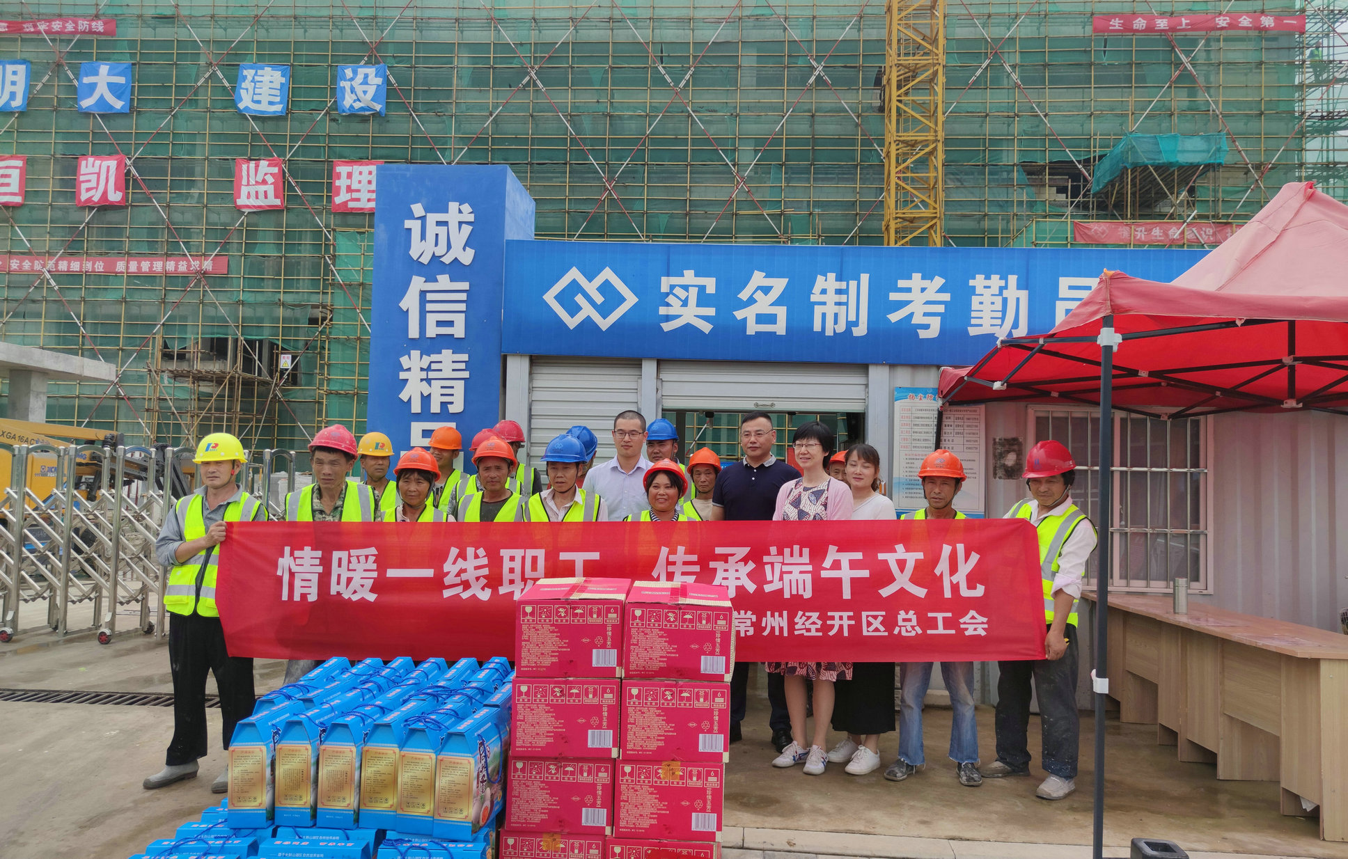 6月24日下午,端午節(jié)來臨之際,常州市經開區(qū)工會金主席一行專程前往綠聯(lián)項目工地開展“情暖一線職工,傳承端午文化”節(jié)日慰問活動,親自為一線工人發(fā)放端午禮品,祝他們節(jié)日快樂,身體安康,并把經開區(qū)領導對綠聯(lián)項目的關心傳達到工地的每一位建設者。永葆環(huán)保工會主席段昌海,項目經理張珂參與此次活動,向領導匯報綠聯(lián)項目的建設進展情況。